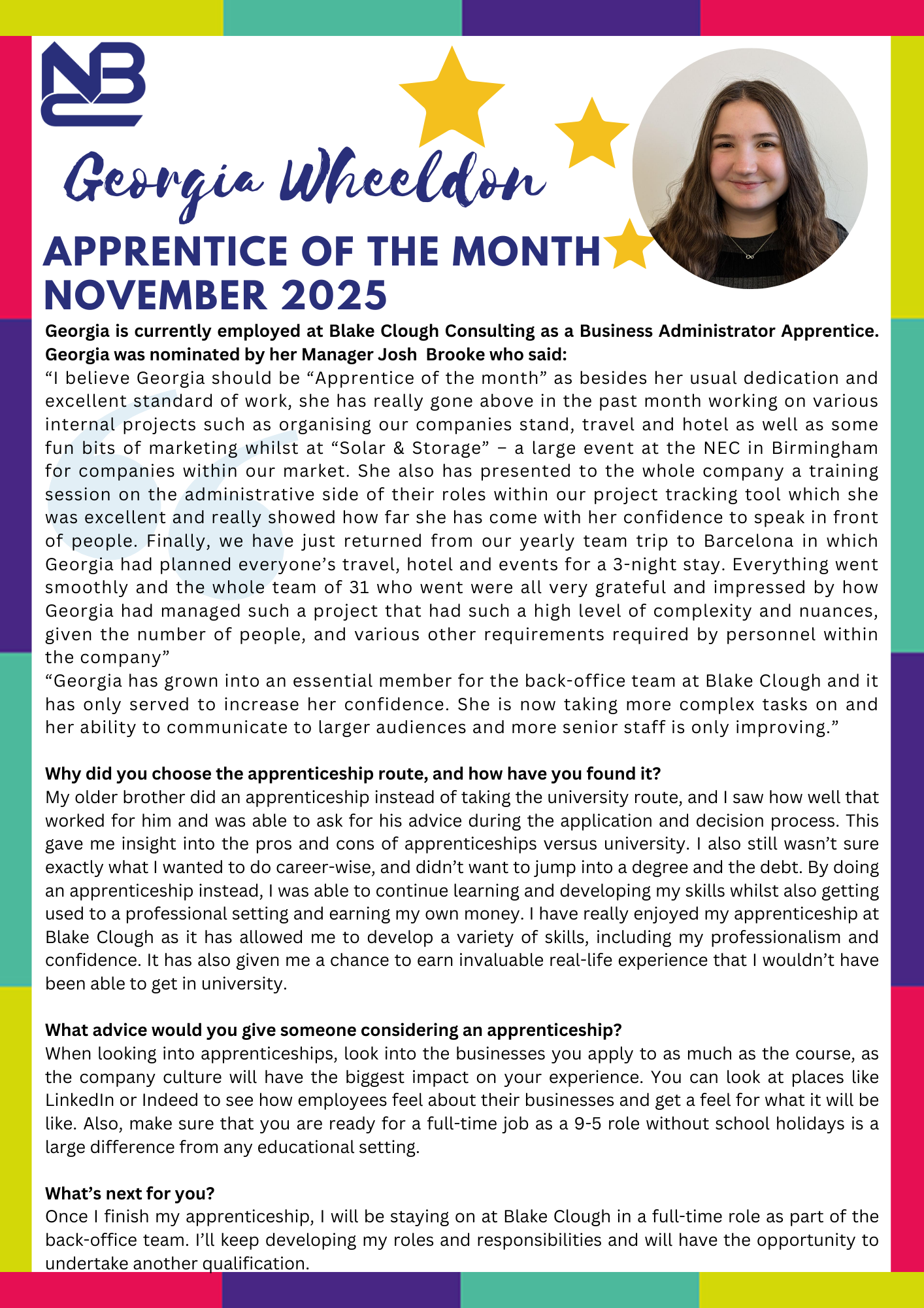 Each month, our Apprenticeship Employers and Trainers at NBC nominate for the Apprentice of the Month award. The nominations could be down to an outstanding piece of work, clear professional or personal growth while on their Apprenticeship Journey or for any other stand out reason! We look for the impact the individual is having within the organisation and that they are fully up to date with their assignments and participate in class, being a role model for other Apprentices.